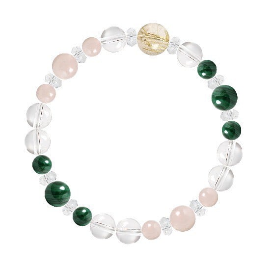 愛と癒しのパワーを持つ ローズクォーツ と、心身を守る マラカイト を組み合わせ、安定と幸福をもたらすデザインに仕上げました。